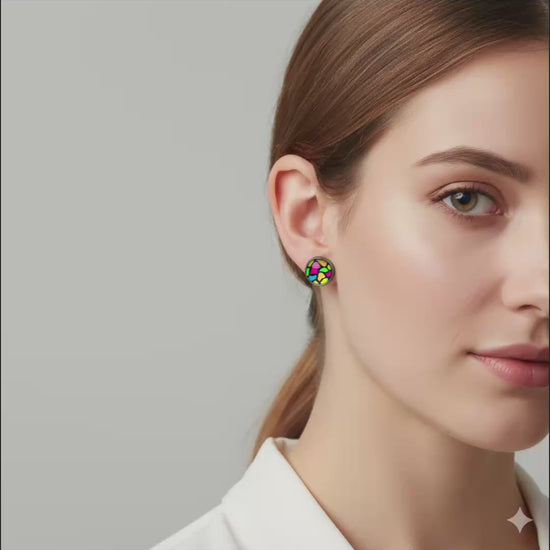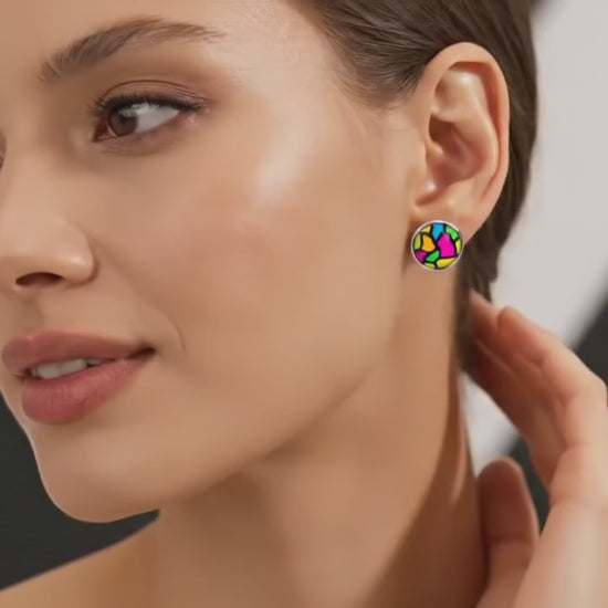 Brighten up your look with these vibrant stained glass–style stud earrings. Featuring a bold rainbow-inspired pattern with splashes of pink, green, yellow, orange, and blue, the glossy glass dome gives the design a beautiful magnified effect that catches the light.