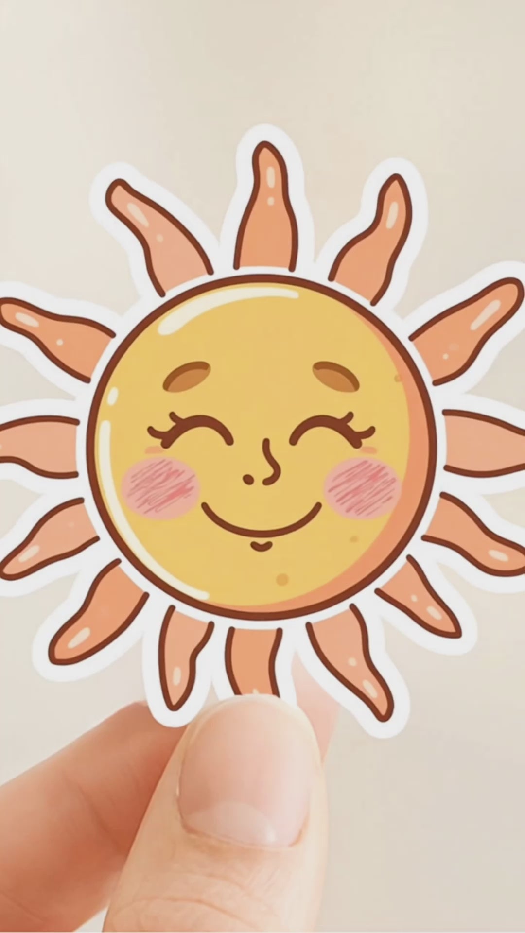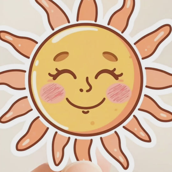 Brighten your day with this Smiling Sun Sticker — featuring a cheerful sun face with rosy cheeks, peach-toned rays, and a sweet, happy expression. Printed on premium white vinyl with a soft satin finish, it brings warmth and positivity to any surface.