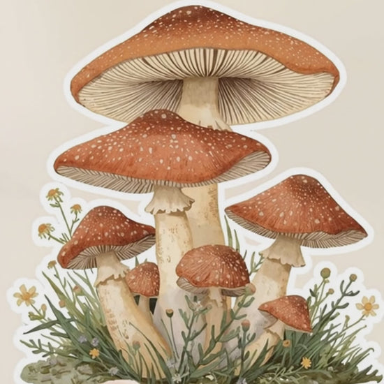 Bring a touch of the forest to your day with this Woodland Mushroom Cluster Sticker — featuring a detailed illustration of red and cream toadstools surrounded by wildflowers and greenery. Printed on premium white vinyl with a soft satin finish, it captures that perfect cottagecore woodland charm.